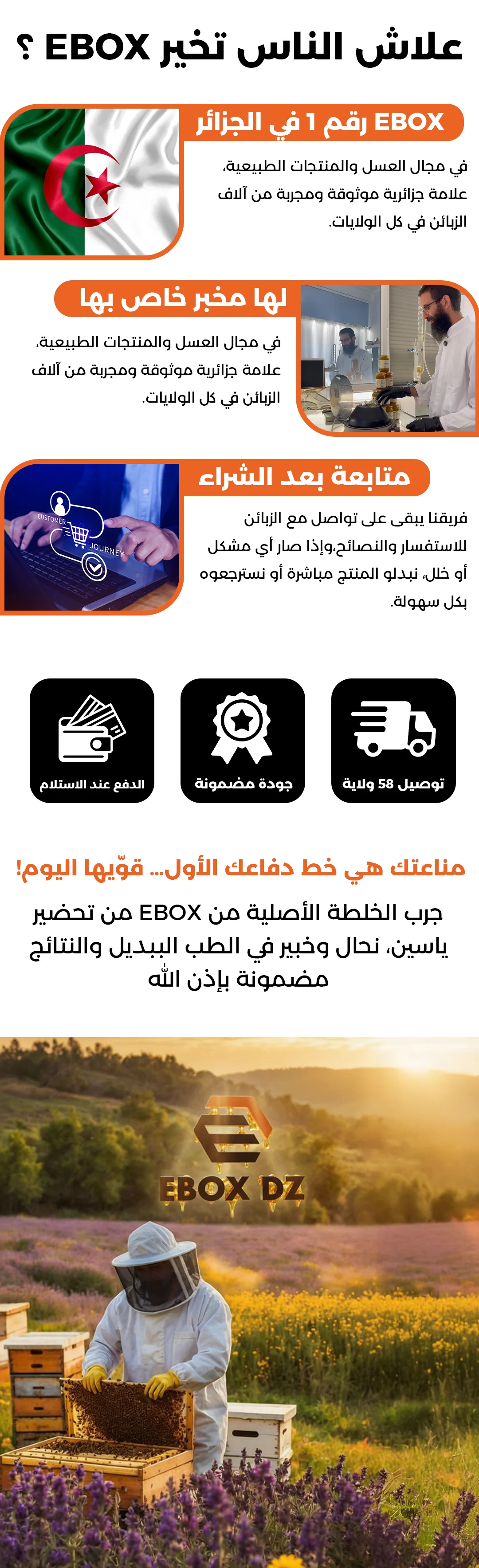 إذا كنت تبحث عن وسيلة طبيعية لتعزيز صحتك العامة ودعم مناعتك باستخدام العسل الحر الطبيعي ومكونات مختارة بعناية، فإن خلطة المناعة تمنحك دعماً متكاملاً في إطار نمط حياة صحي ومتوازن.