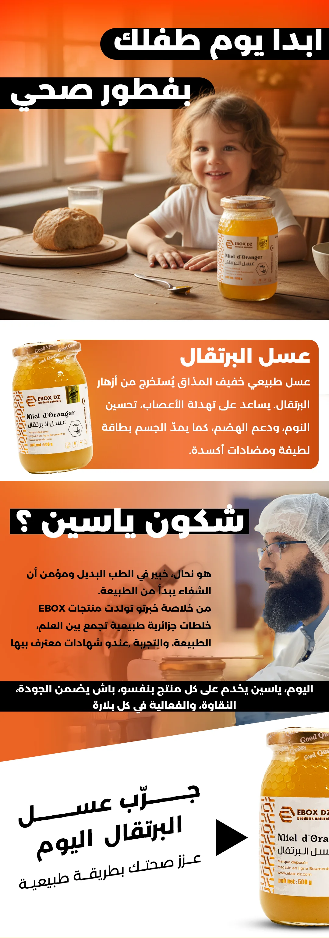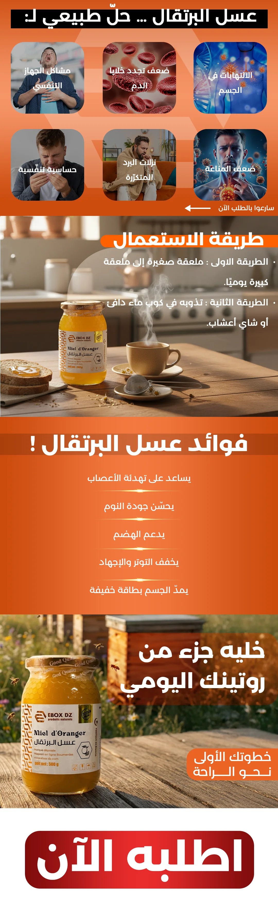 عسل البرتقال مهدئ طبيعي ممتاز ذو لون فاتح و رائحة زهرية مفيد للأرق و الصداع، مضاد للجراثيم، مفيد للوقاية من الزكام، يرطب البشرة و يلطف الجروح، كما انه منشط قوي.